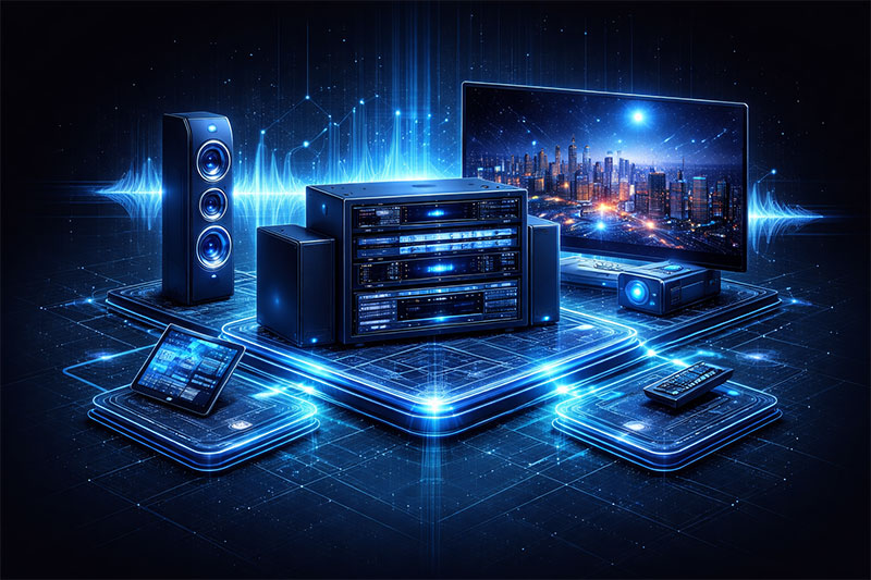 Projektujemy i realizujemy kompleksowe instalacje AV dla przestrzeni prywatnych oraz komercyjnych. Tworzymy systemy audio-wideo dopasowane do charakteru wnętrza, oczekiwań użytkownika oraz sposobu korzystania z przestrzeni — od domowych systemów stereo po rozbudowane instalacje nagłośnieniowe, konferencyjne i multimedialne.